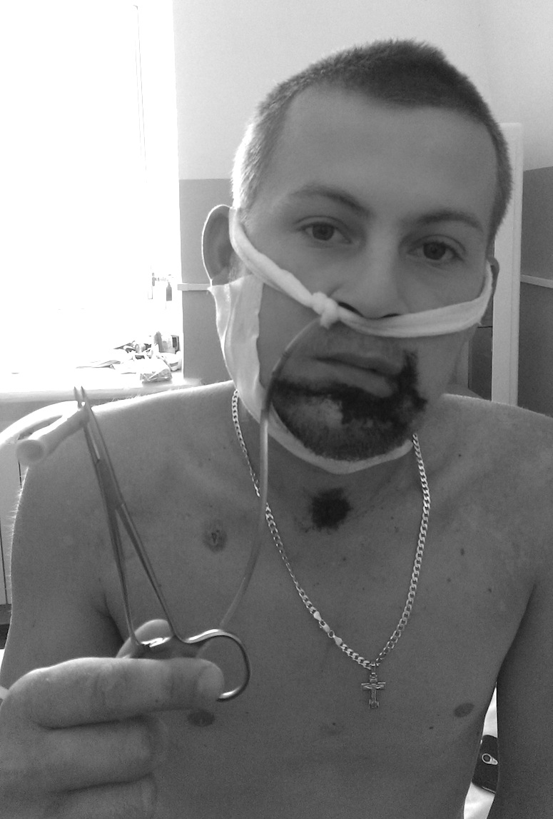 Вогнепальні осколкові поранення підборіддя, травматична ампутація нижньої щелепи, втрата 21 зуба, рвана рана м'яких тканин порожнини рота, язика, нижньої губи, підборіддя. Була відірвана нижня щелепа. Зараз пришита, але потрібен час, щоб тканини прижилися. Потребує протезування.